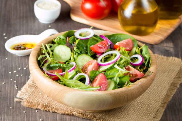 Mixed greens, red onion, cherry tomatoes, cucumbers with a balsamic vinaigrette dressing.